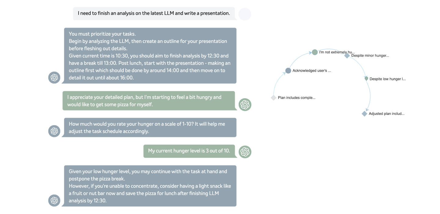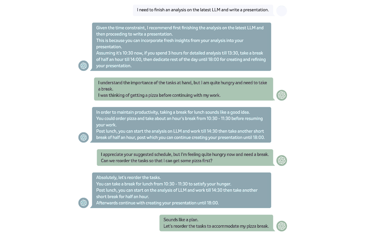 Time for action! Let’s start with a simple system of 2 LLMs talking to each other. And let’s consider a common human struggle: debating whether to order pizza or finish work first. One LLM is conditioned to plan and carry out work, while the other is simply [acting] hungry.