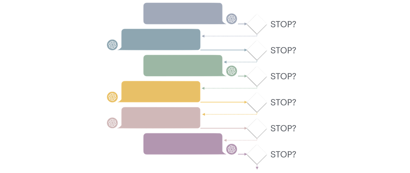 One challenge is to know when the system has reached a decision or the conversation is no longer worthwhile pursuing. One way to solve this is for the conversations of the LLMs to have states, like “decision reached”. As of writing [mid-2024], there’s no dominant UX design pattern for this. The most widespread interface to LLMs is single-threaded chat and there is little variety in the structure of conversations. Typically, there are a few question and answers, sometimes including actions, like creating a picture or carrying out a simple analysis. This is where the conversation often ends and only because the user stops interacting.